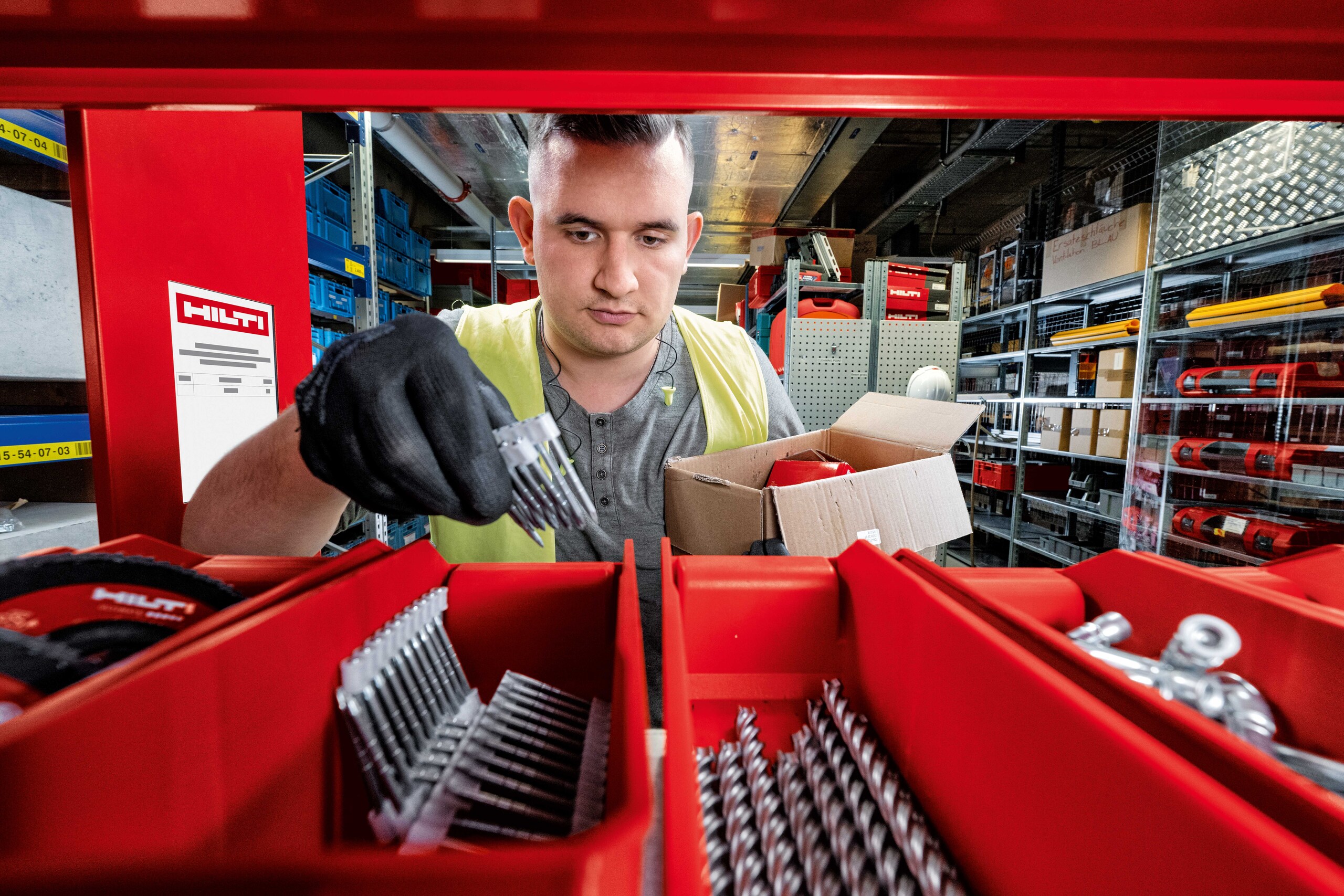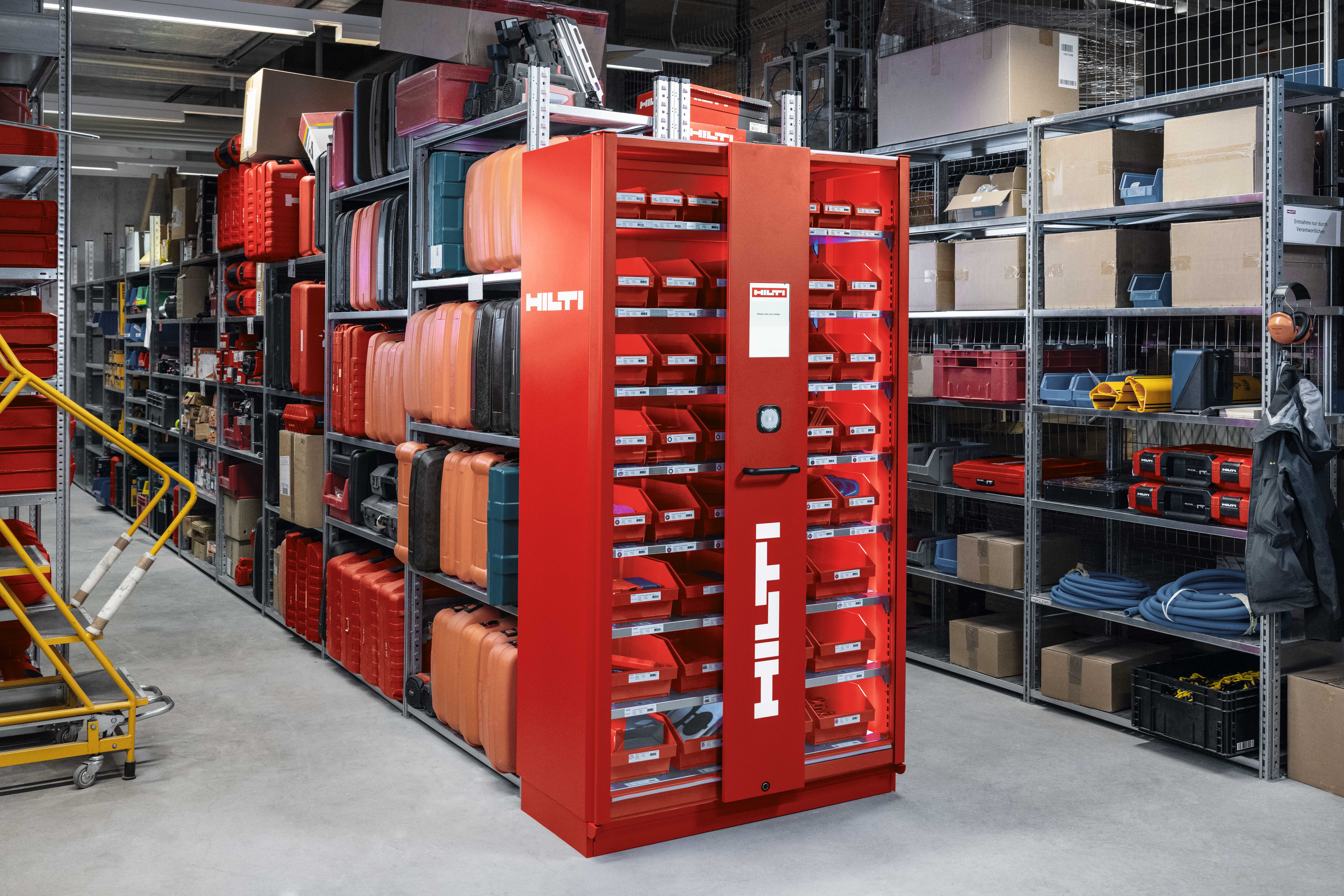 Eine zentrale Komponente des CMS ist der Connected Locker, ein vernetzter Verbrauchsmaterialschrank, der Mitarbeitenden rund um die Uhr per Chip Zugang gewährt und gleich-zeitig eine komfortable, transparente Kontrolle von Echtzeit-Beständen der Verbrauchsmaterialien und des Zugriffs bietet. Es handelt sich hierbei um einen Schrank für Verbrauchsmaterialien, die in Behältern auf den Regalböden einsortiert werden. Durch eine intelligente Füllstandüberwachung im Locker wird der Materialbestand verlässlich digital erfasst. Sobald ein definierter Mindestbestand unter-schritten ist, wird eine Nachbestellung ausgelöst. Der Zugriff auf den Materialschrank erfolgt über RFID-Chips, auf denen individuelle Berechtigungen hinterlegt werden können. Ein kurzes Vorhalten des Chips öffnet die Tür und Materialien können entnommen werden. Ein integriertes Waagensystem erfasst jede Materialbewegung automatisch und überträgt die Informationen an die digitale und bewährte Hilti Betriebsmittelverwaltung ON!Track. Alle relevanten Daten, von der Menge über die entnehmende Person bis hin zur Kostenstelle und dem Projekt, werden in Echtzeit dokumentiert. Unterneh-men erhalten so eine deutlich höhere Transparenz über den Verbrauch und profitieren von einer präzisen, projektbezogenen Abrechnung. Fehlbestände werden vermieden, da das Sys-tem eine automatische Nachbestellung anstößt, sobald die Mengen unter den hinterlegten Mindestwert fallen. Gleichzeitig werden Schwund und unkontrollierte Entnahmen erheblich reduziert. Die modularen Regalböden des Lockers bieten Platz für insgesamt 44 Behälter in drei verschiedenen Größen, wodurch sich unterschiedlichste Verbrauchsmaterialien strukturiert und übersichtlich einlagern lassen. Automatisiertes Bestellen anhand von Echtzeitdaten mit Hilti Refill