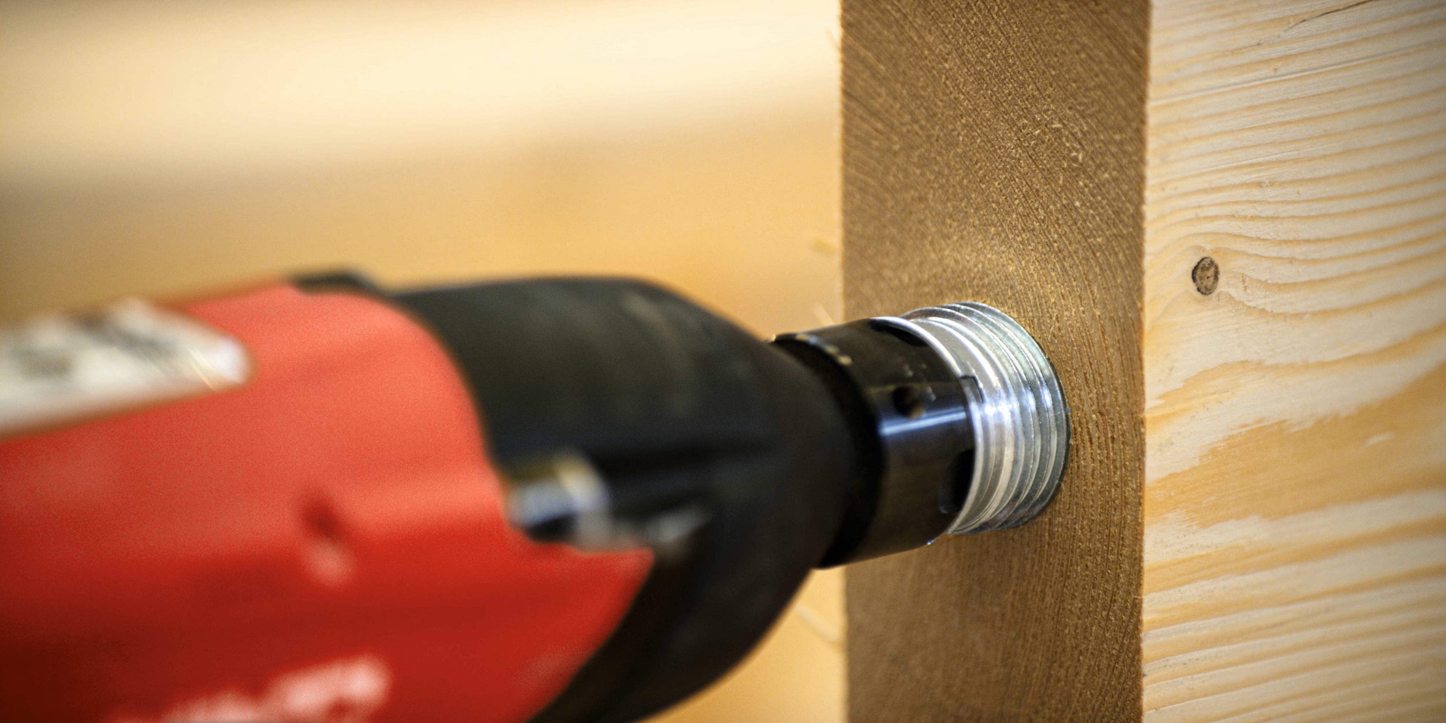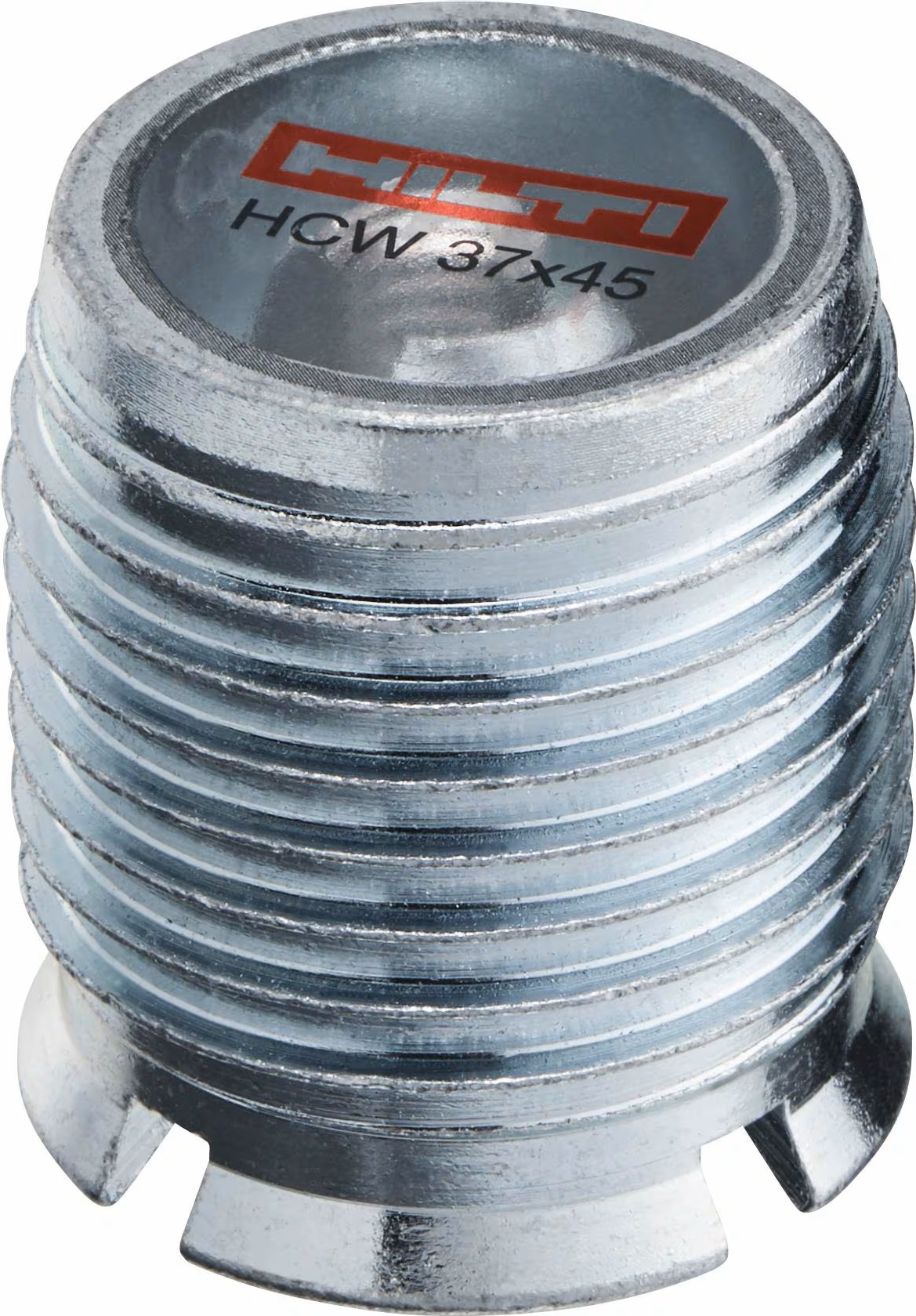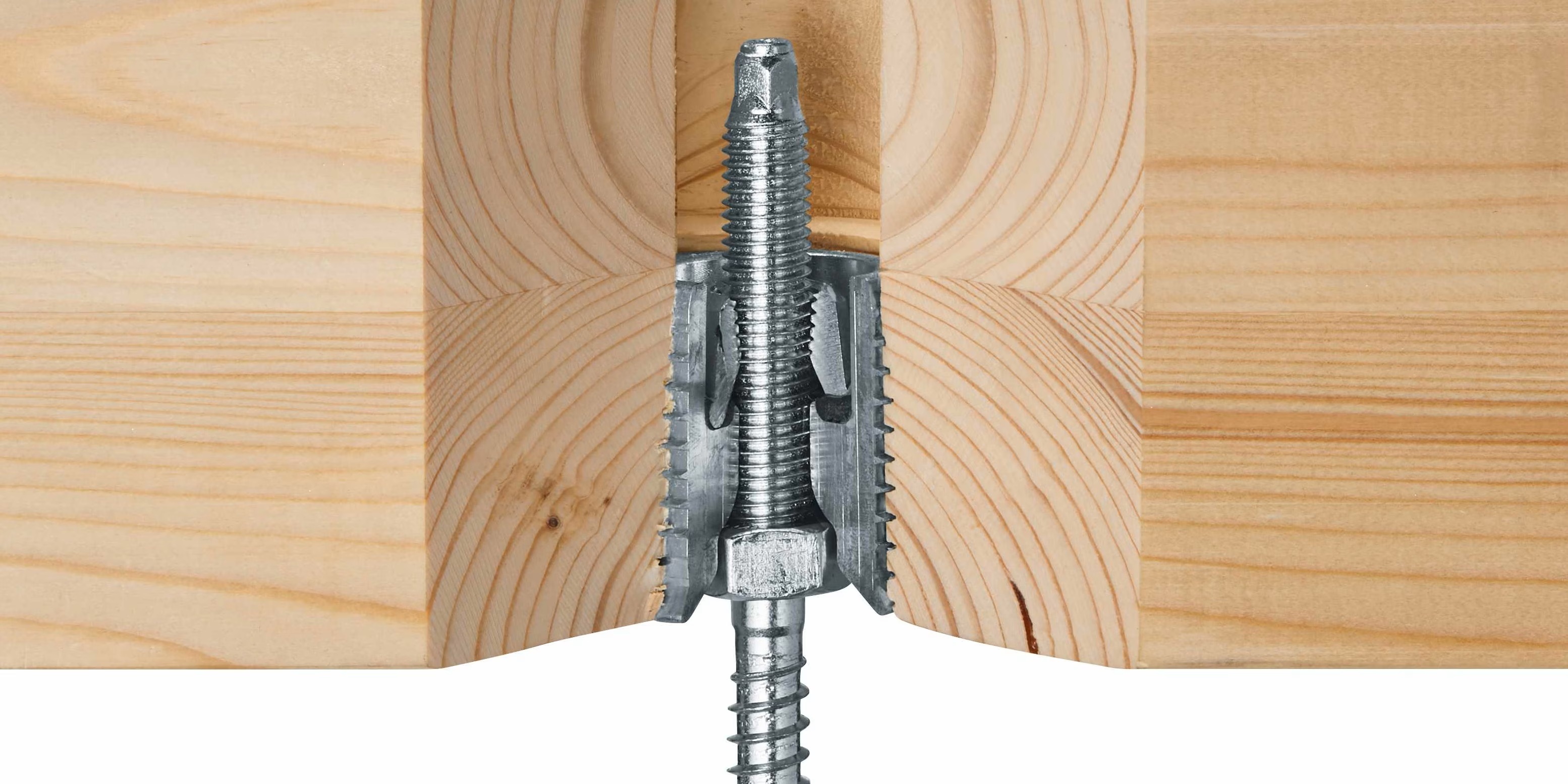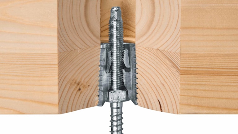 Der Holzverbinder HCW 37x45 M12 für verdeckte Befestigungen bei Schwerbeanspruchungen und für geringere Zuglasten verfügt über einen Außendurchmesser von 40 mm. Über ein Außengewinde schneidet er sich in das CNC-vorgebohrte Holz ein und gewährleistetet durch seine Führung eine gerade Montage beim flächenbündigen Einbau in Holzrahmenschwellen oder Brettsperrholz. Eine Schutzkappe verhindert dabei das Eindringen von Spänen und Schmutz in das Innengewinde mit Klemmen. Das Innengewinde verfügt über einen Klick-Befestigungsmechanismus für die Bolzenanker HST3, die Ankerstangen HAS-U oder die Stockschrauben HSW.