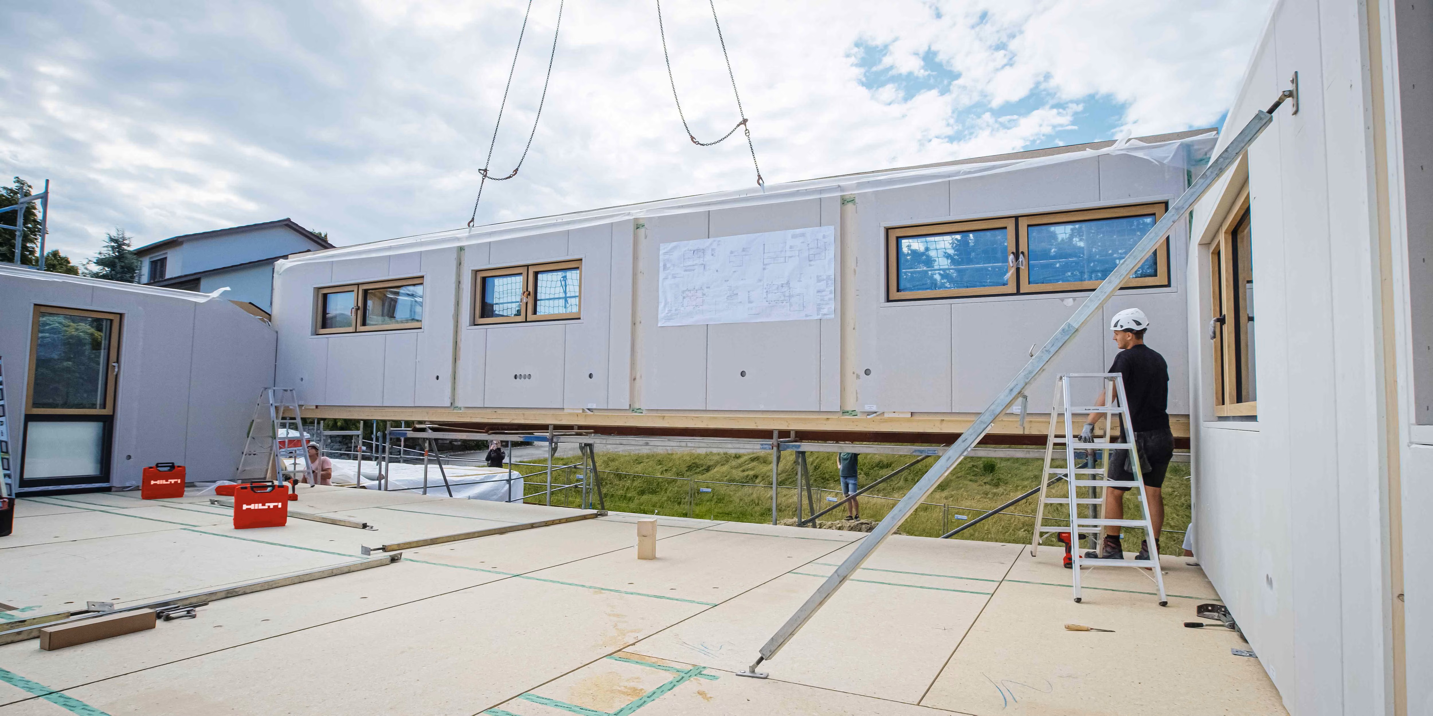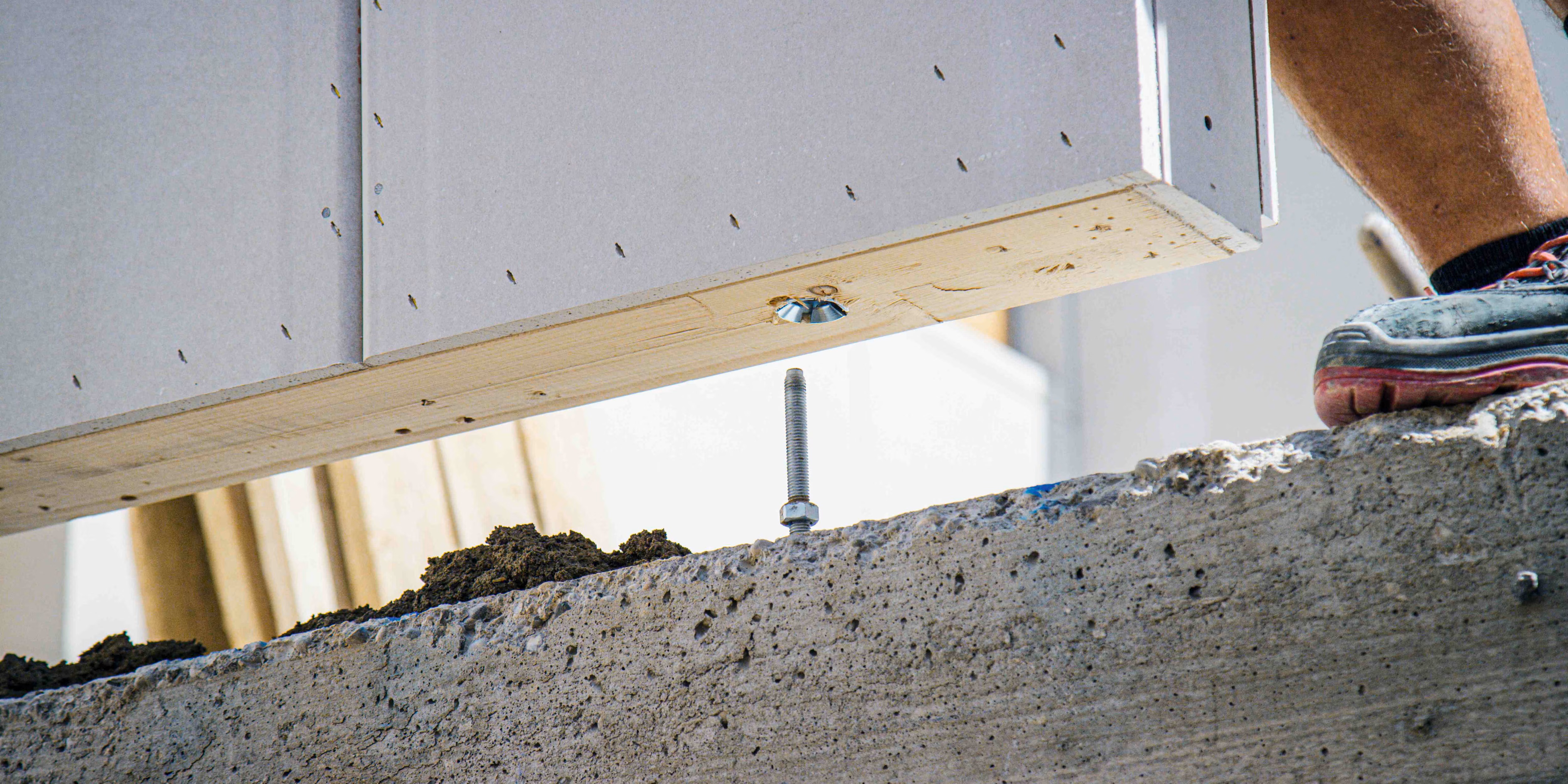 Der Montagetermin kann mit dem HCW Holzverbindersystem terminlich von der Vorbereitung der Bodenplatte entkoppelt werden. Eine Reduzierung der logistischen Aufwände ist möglich. Beim Aufrichten werden die Wände ganz einfach in die gesetzten Anker mit Gewindestangen-Überstand eingerastet. Die Präzision dieses Vorgehens sowie die Qualität der Verbindungen führen zu weniger kostspieligen Nacharbeiten. Da keine Winkel im Weg sind, gehen alle nachfolgenden Arbeiten deutlich leichter von der Hand. Ebenso führt die HCWVerbindung zu einer höheren Sicherheit, denn Stolperfallen wird vorgebeugt. Durch den Einsatz der Stockschraube HSW kann die Steckverbindung auch ab dem ersten Obergeschoss eingesetzt werden. Letztlich wird ein deutlich schnellerer Baufortschritt mit einer höheren Präzision möglich.