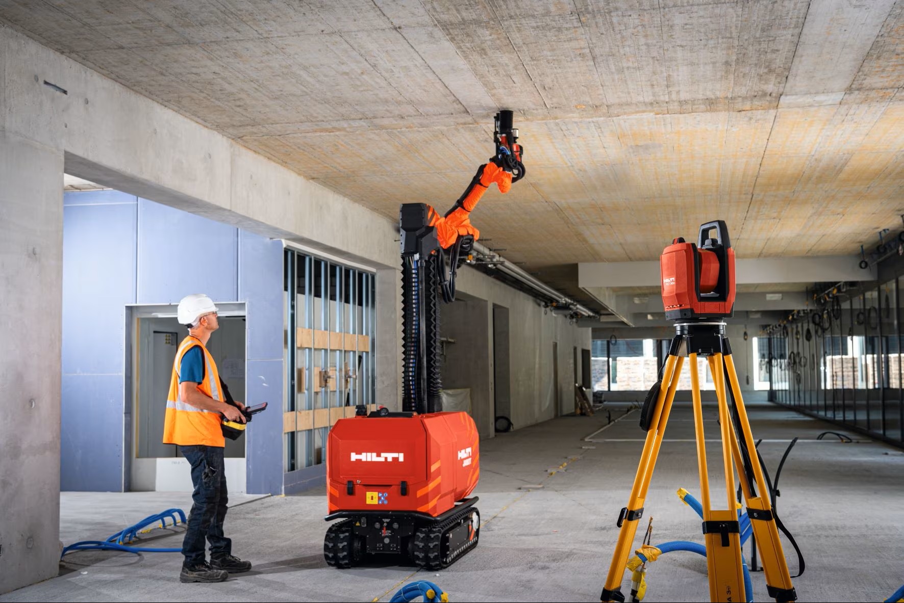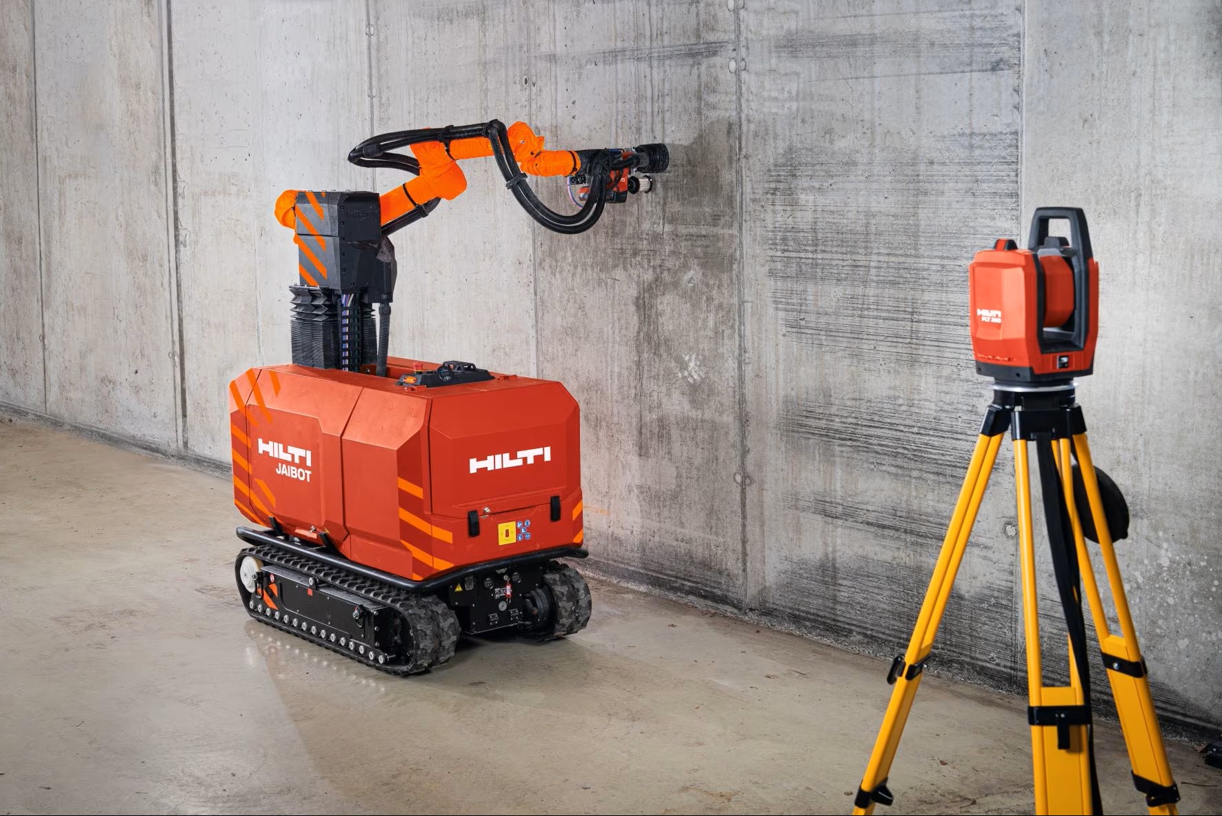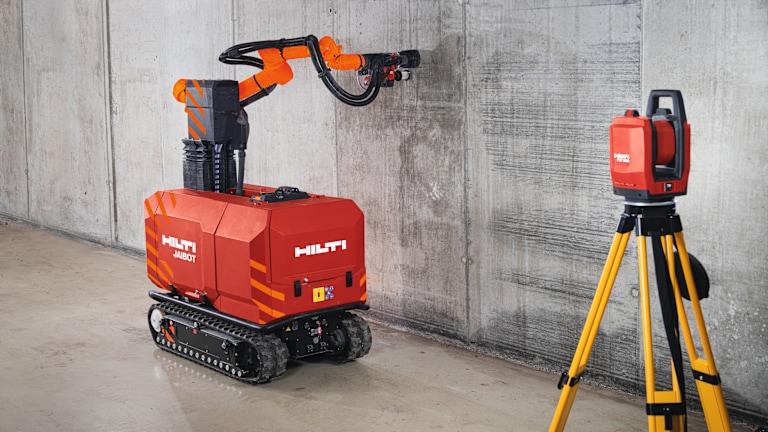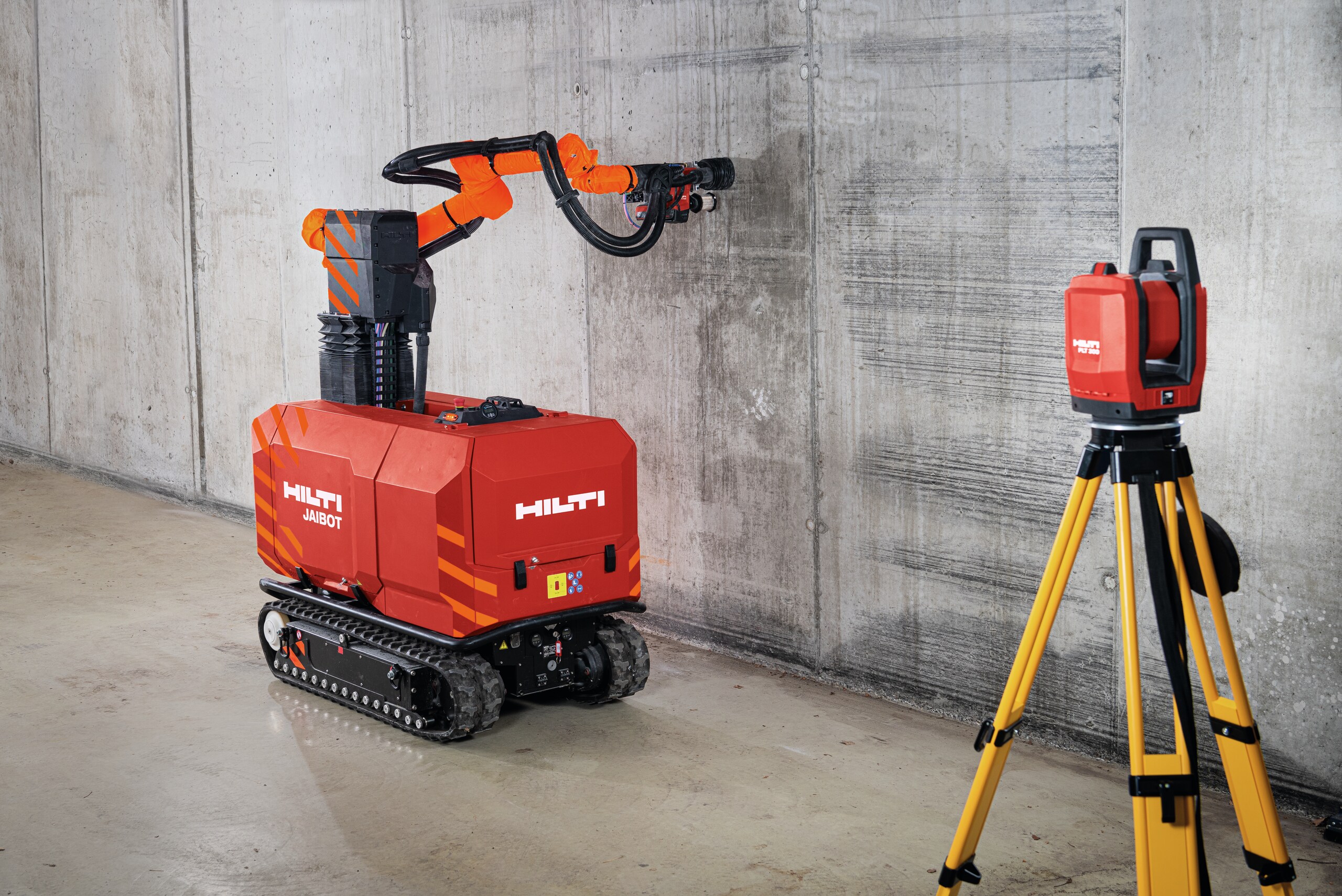 Der Jaibot ist der semi-autonome Bohrroboter von Hilti, der Bohrungen für Dübel-Befestigungen auf der Grundlage digitaler Planungsdaten selbstständig ausführt. In Kombination mit der Einmessung via Totalstation PLT 300 wird der kabellose Robotereingerichtet und komfortabel und ergonomisch per Fernsteuerung positioniert. Während des Einsatzes arbeitet sich der Bohrroboter plangemäß durch den Raum, bohrt und kennzeichnet die Löcher entsprechend dem Datenmodell für die unterschiedlichen Gewerke.