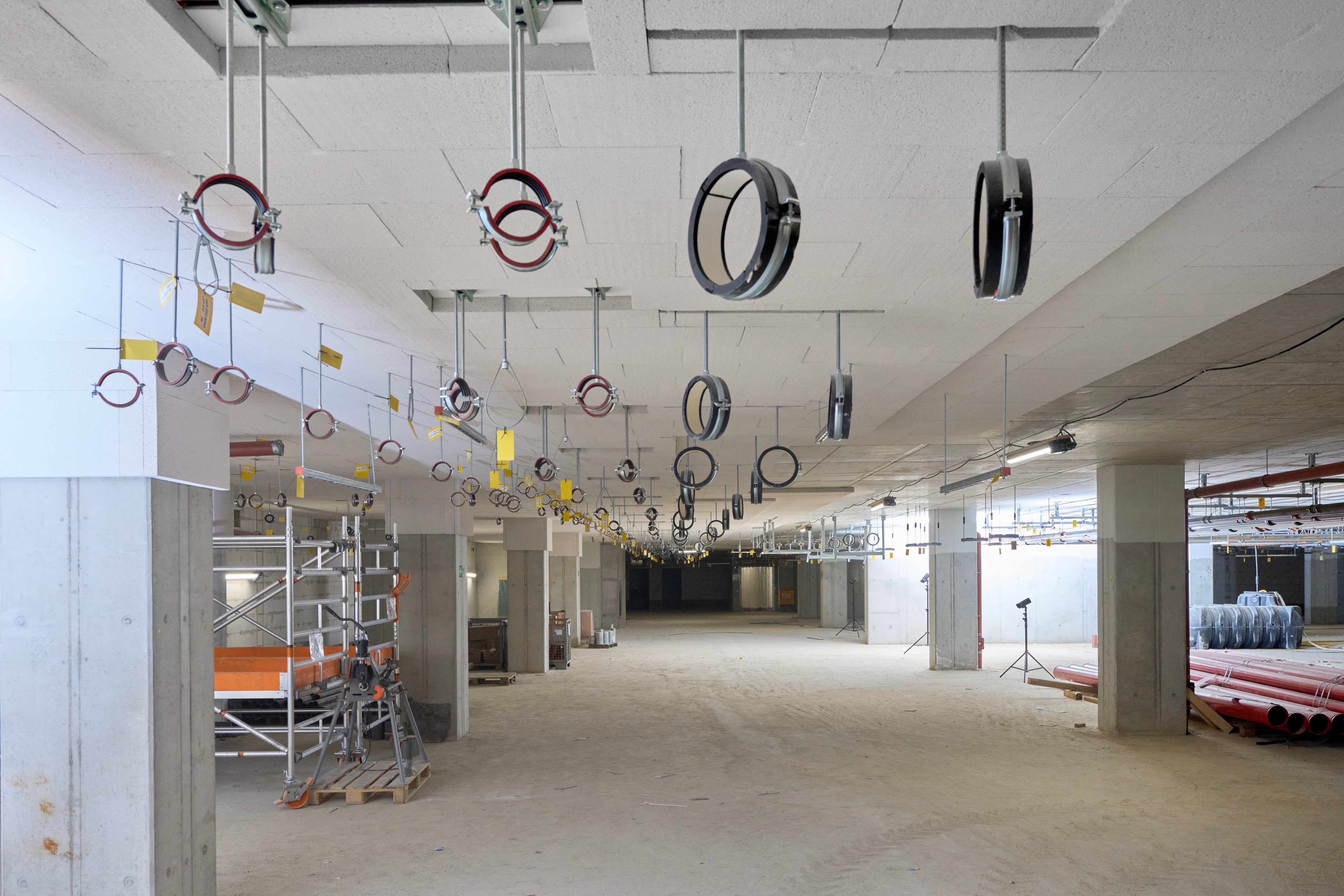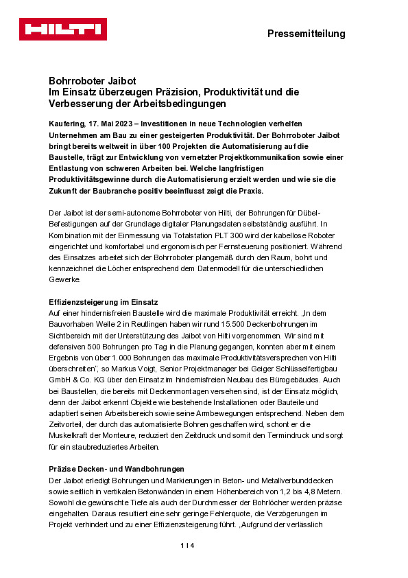 Effizienzsteigerung im Einsatz Auf einer hindernisfreien Baustelle wird die maximale Produktivität erreicht. „In dem Bauvorhaben Welle 2 in Reutlingen haben wir rund 15.500 Deckenbohrungen im Sichtbereich mit der Unterstützung des Jaibot von Hilti vorgenommen. Wir sind mit defensiven 500 Bohrungen pro Tag in die Planung gegangen, konnten aber mit einem Ergebnis von über 1.000 Bohrungen das maximale Produktivitätsversprechen von Hilti überschreiten“, so Markus Voigt, Senior Projektmanager bei Geiger Schlüsselfertigbau GmbH & Co. KG über den Einsatz im hindernisfreien Neubau des Bürogebäudes. Auch bei Baustellen, die bereits mit Deckenmontagen versehen sind, ist der Einsatz möglich, denn der Jaibot erkennt Objekte wie bestehende Installationen oder Bauteile und adaptiert seinen Arbeitsbereich sowie seine Armbewegungen entsprechend. Neben dem Zeitvorteil, der durch das automatisierte Bohren geschaffen wird, schont er die Muskelkraft der Monteure, reduziert den Zeitdruck und somit den Termindruck und sorgt für ein staubreduziertes Arbeiten.