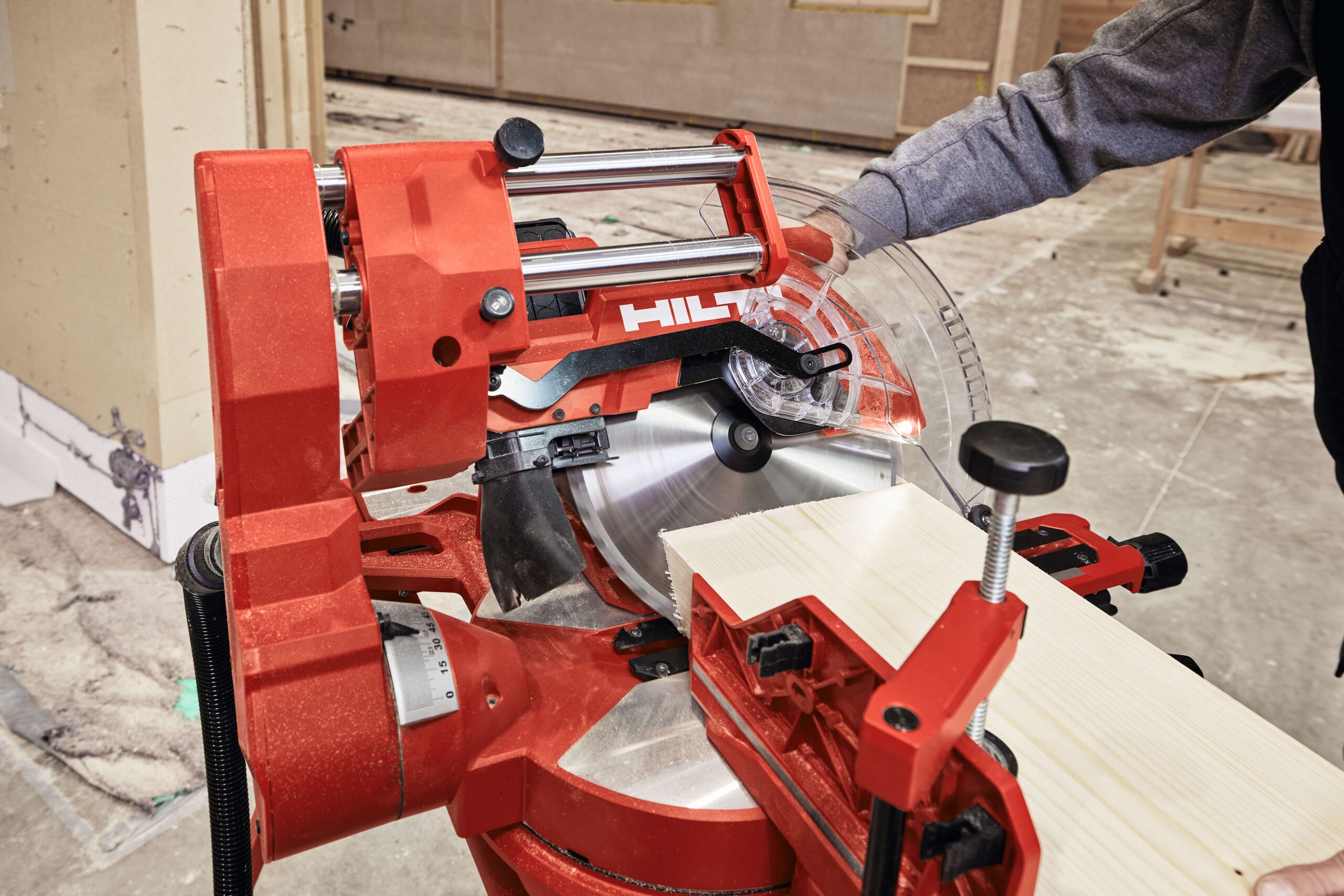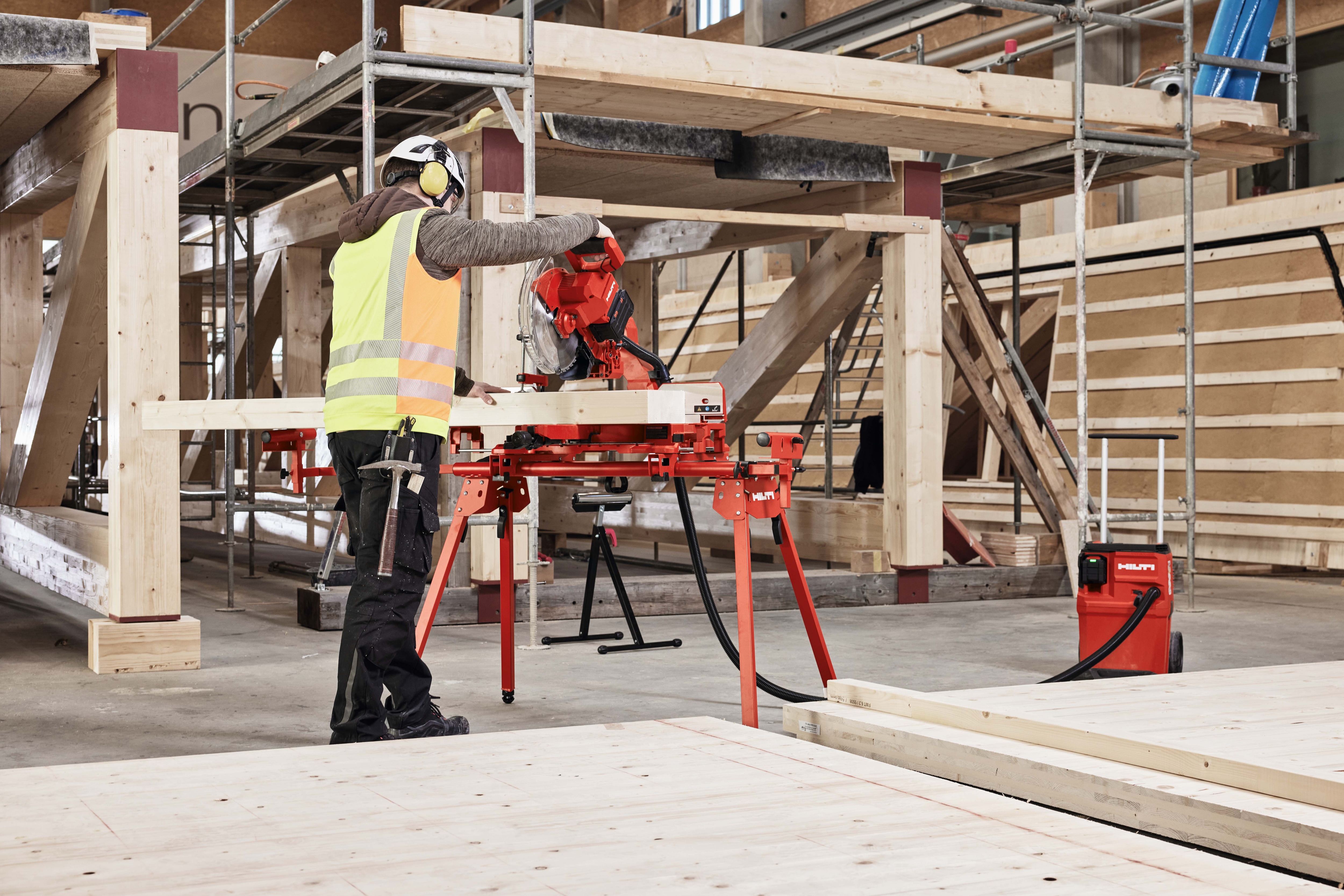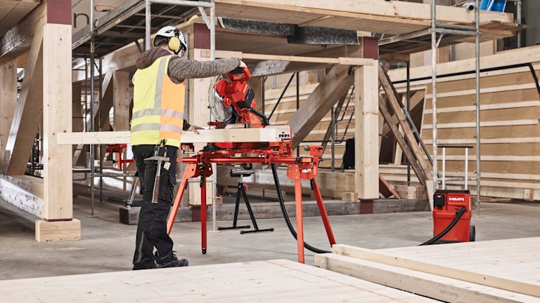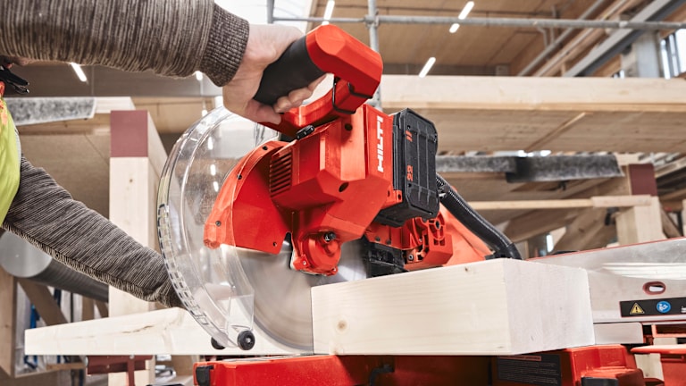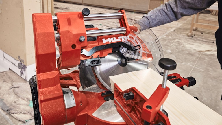Die vorwärts gleitenden Schienen sparen Platz und die frontseitigen Neigungsverstellungen erleichtern die Handhabung und erhöhen die Effizienz am Arbeitsplatz. Die Führungsschienen sind leichtgängig und ermöglichen präzise Ergebnisse ohne großen Kraftaufwand. Eine schnelle Blattbremse und eine effektive Staubabsaugung sorgen für ein sicheres und sauberes Arbeitsumfeld. Für mehr Sicherheit und Kontrolle beim Sägen hat Hilti diese Säge mit einer Einschaltsperre am Handgriff ausgestattet. Intuitive Einstellmöglichkeiten für Schnitttiefe, Gehrungsanschlag, Winkel- und Fasengenauigkeit sowie Drehzahl ermöglichen ein präzises und effizientes Arbeiten. An den Absaugstutzen kann wahlweise ein Staubbeutel für ein sauberes Arbeiten oder ein Staubfänger in Kombination mit einem Staubsauger, wie z.B. Hilti VC 4MX-22, zur Vermeidung der Zirkulation von gesundheitsgefährdenden Stäuben, angeschlossen werden.