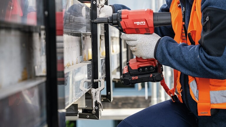 Mit dem Akku-Blindnietgerät RT 6-22 von Hilti lassen sich flächige Bauteile wie zum Beispiel Fassaden in den unterschiedlichsten Anwendungen mühelos mit nur einem Handgriff vernieten. Gerade wenn die Oberfläche optisch ansprechend sein soll oder es schnell gehen muss, ist das Nieten eine beliebte Option. Ein neuer Haltevorsatz zum Festhalten der Niete bei Abwärtsarbeiten verhindert das Herausfallen der Niete und hat den großen Vorteil, dass mit nur einer Hand schneller gearbeitet werden kann. In Kombination mit dem kabellosen Akkuantrieb führt dies zu mehr Bewegungsfreiheit und trägt zu mehr Sicherheit bei der Befestigung von Fassaden in der Höhe bei. Das Akku-Blindnietgerät RT 6-22 ist mit verschiedenen Nietgrößen und -typen kompatibel und verfügt über ein leicht auswechselbares Mundstück, das die Anpassung an unterschiedliche Anwendungen ermöglicht. Eine Halterung am Gerätefuß sorgt dafür, dass die verschiedenen Nietköpfe jederzeit griffbereit sind.
