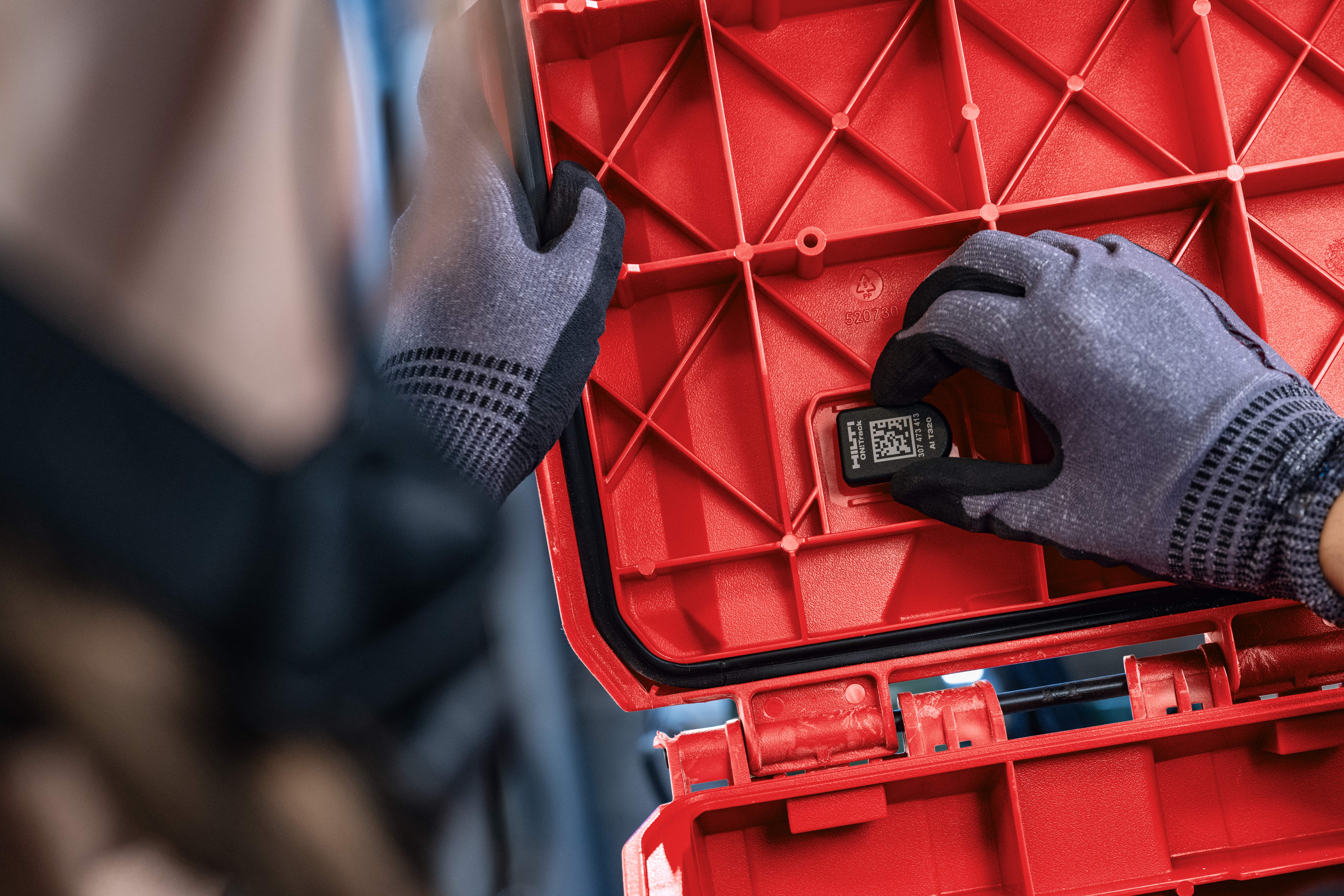 An den Koffern und Taschen sind an mehreren Stellen Halterungen für aktive und passive ON!Track Tags vorgesehen, sodass die gesamten Transportboxen oder die getaggten einzelnen Werkzeuge einfach über das Hilti Betriebsmittelverwaltungssystem ON!Track verfolgt werden können.
