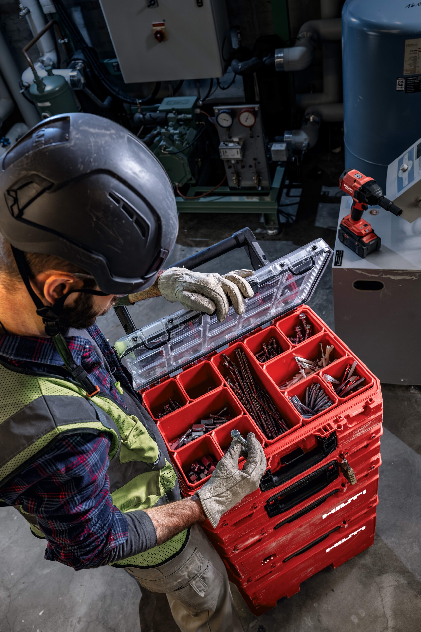 Die automatische Verriegelung des Kofferdeckels verhindert ein Verschütten und Vermischen des Inhalts ohne zusätzlichen Kraftaufwand. Für kleinere Verbrauchsmaterialien wie Dübel, Schrauben und andere Installationsmaterialien stehen modulare Organisationselemente in unterschiedlichen Größen zur Verfügung.