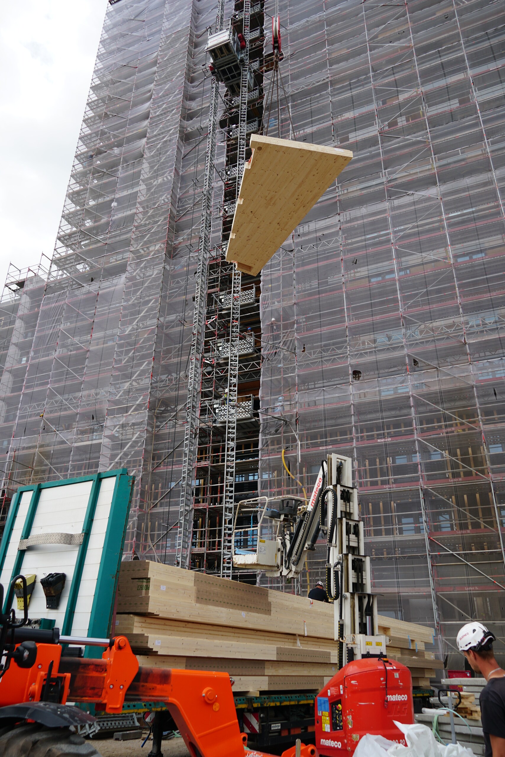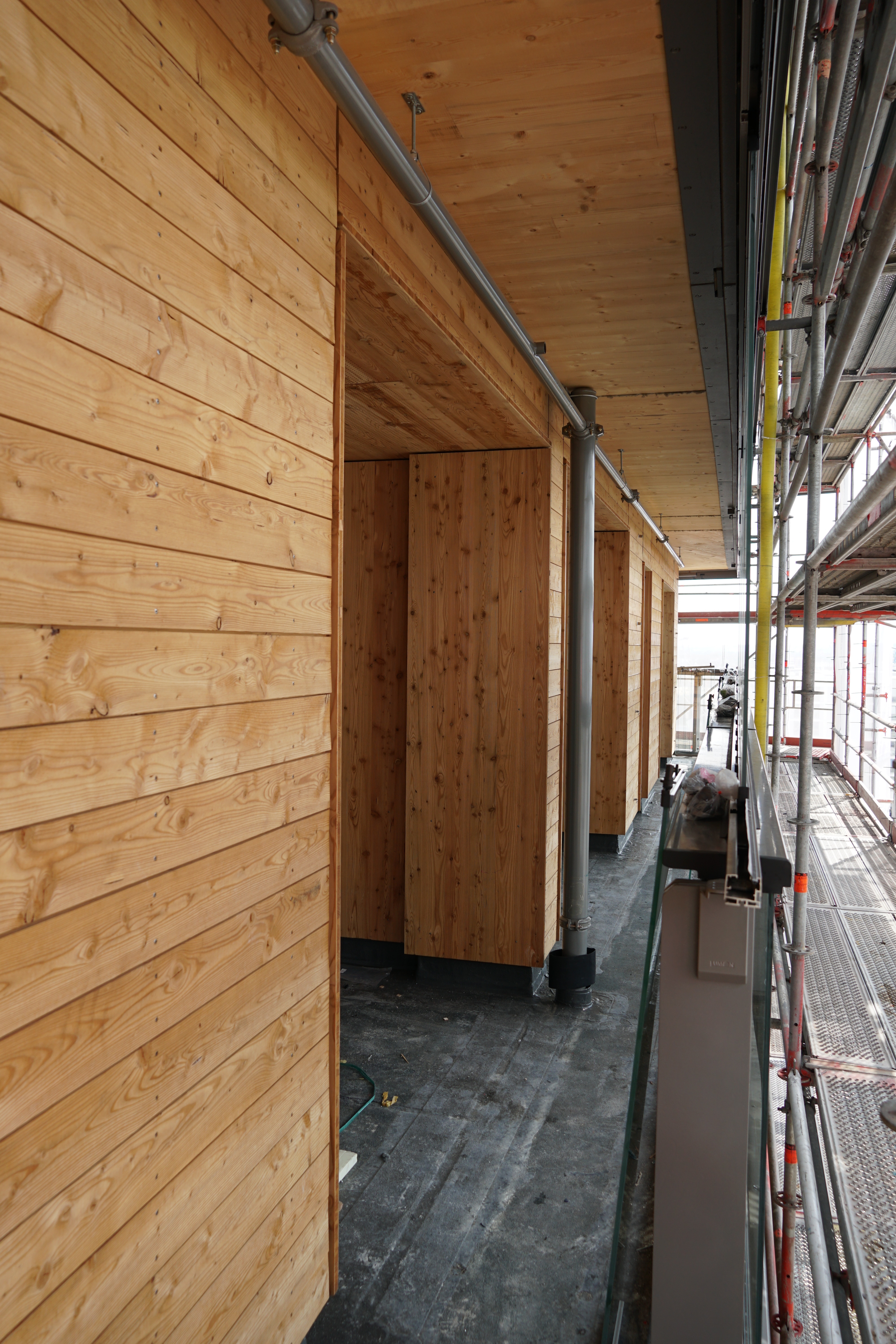 Das Erstellen eines Brandschutzkonzepts für einen mehrgeschossigen Holzbau dieser Größenordnung ist grundsätzlich eine Herausforderung, da die normativen Grundlagen für Brandschutzprodukte, die für Abschottungen im Massivbau gelten, noch nicht abschließend vorhanden sind. „Für alle sich im Gebäude befindlichen Abschottungsarten muss eine detaillierte Planung erfolgen. Dies bedeutet, dass für alle Abschottungssituationen Prüfergebnisse aus Normbrandversuchen vorliegen müssen, um hier einen Nachweis über 90 Minuten zu erwirken“, fasst Nils Eichentopf-Janssen, M. Eng. Brandschutz, Hilti Deutschland AG, die Herausforderungen zusammen. Bei rund 1.500 Abschottungen im Gebäude plus vieler zusätzlich benötigter Abschottungen wie z.B. Gebäudefugen, ein umfangreiches Unterfangen. Daneben mussten auch noch einige zusätzliche Brandschutzprüfungen für einzelne Rohre durchgeführt werden, da die für den Bau vorgeschriebene Sprinkleranlage durch Holzdecken und Holzfußböden sowie entlang der Holzfassade des Gebäudes geführt wird.